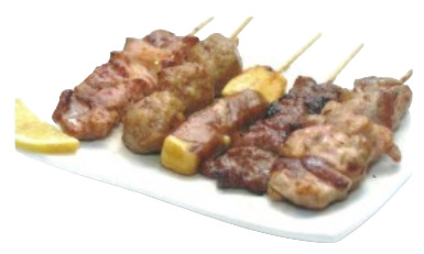 Salade, soupe, riz; 7 brochettes : 1 bœuf, 1 poulet, 1 bœuf au fromage, 1 boulette de poulet, 1 gambas, 1 canard, 1 aile de poulet